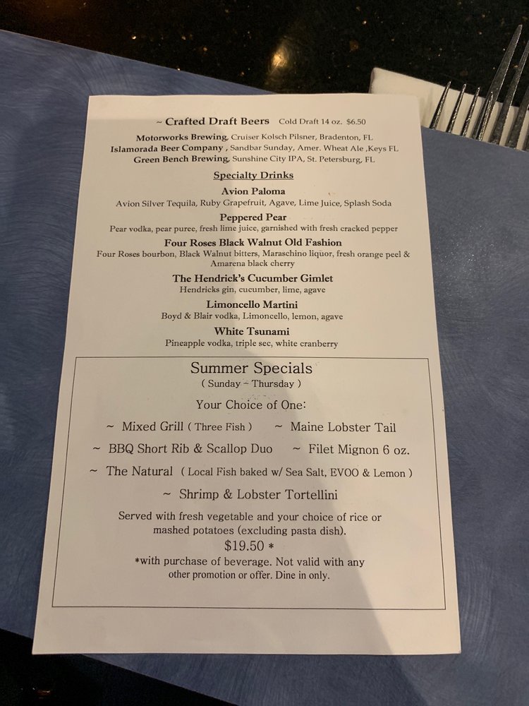 Mystic Fish Seafood Grill & Bar is a tapas/small plates bar with a focus on seafood. Located in Palm Harbor, FL, this restaurant offers a wide range of utilities, including takeout, delivery, and outdoor seating. The menu features early dinner options like Kona Crusted Salmon and Chicken Milanese. Customers praise the professional service and outstanding food, with dishes such as lobster escargot and sea scallops receiving high acclaim. The ambiance, quality service, and unique dishes make Mystic Fish a top choice for seafood lovers. The restaurant's happy hour specials, craft cocktails, and delicious entrees like the Bison Filet and Swordfish further enhance the dining experience. Overall, Mystic Fish Seafood Grill & Bar is a must-visit for those seeking a memorable seafood dining experience.